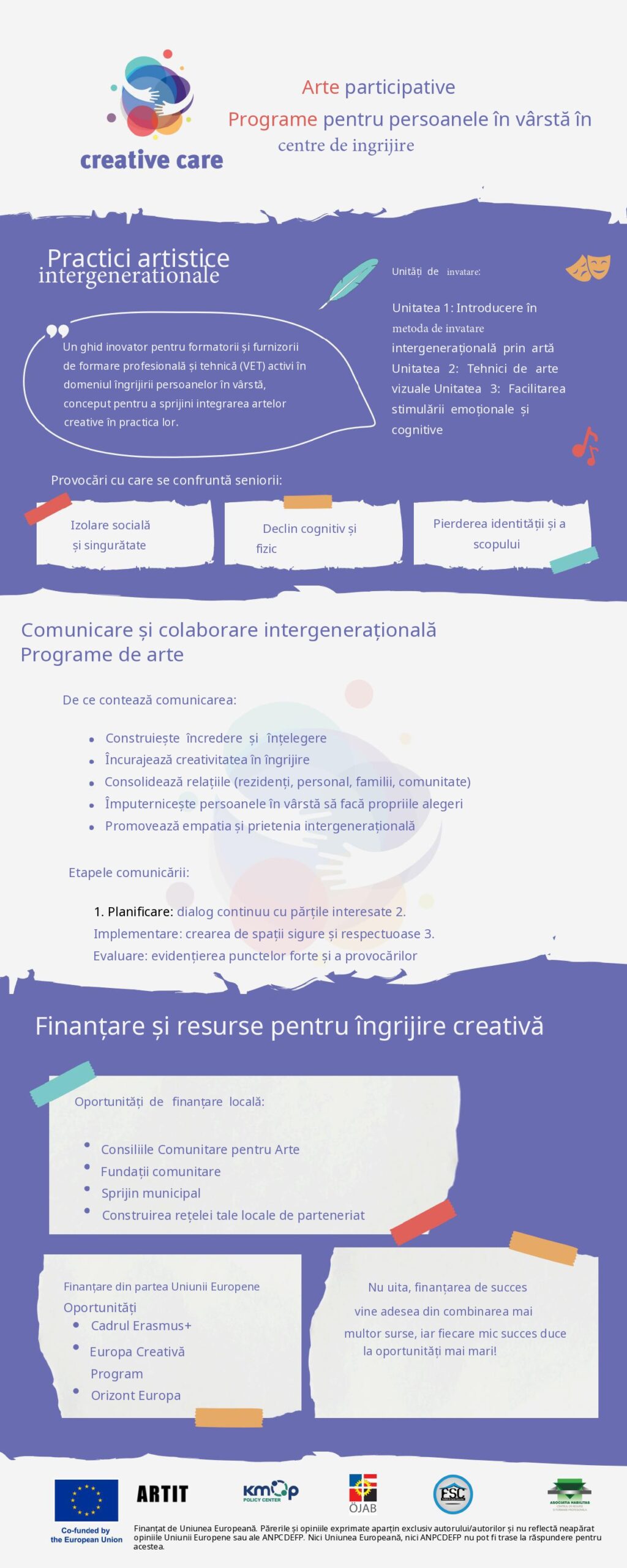 Resursele de formare pentru furnizorii VET includ informații relevante și ușor de înțeles despre abordarea intergenerațională și despre proiectarea și implementarea programelor de artă participativă pentru persoanele în vârstă în contextul setărilor de îngrijire medicală.