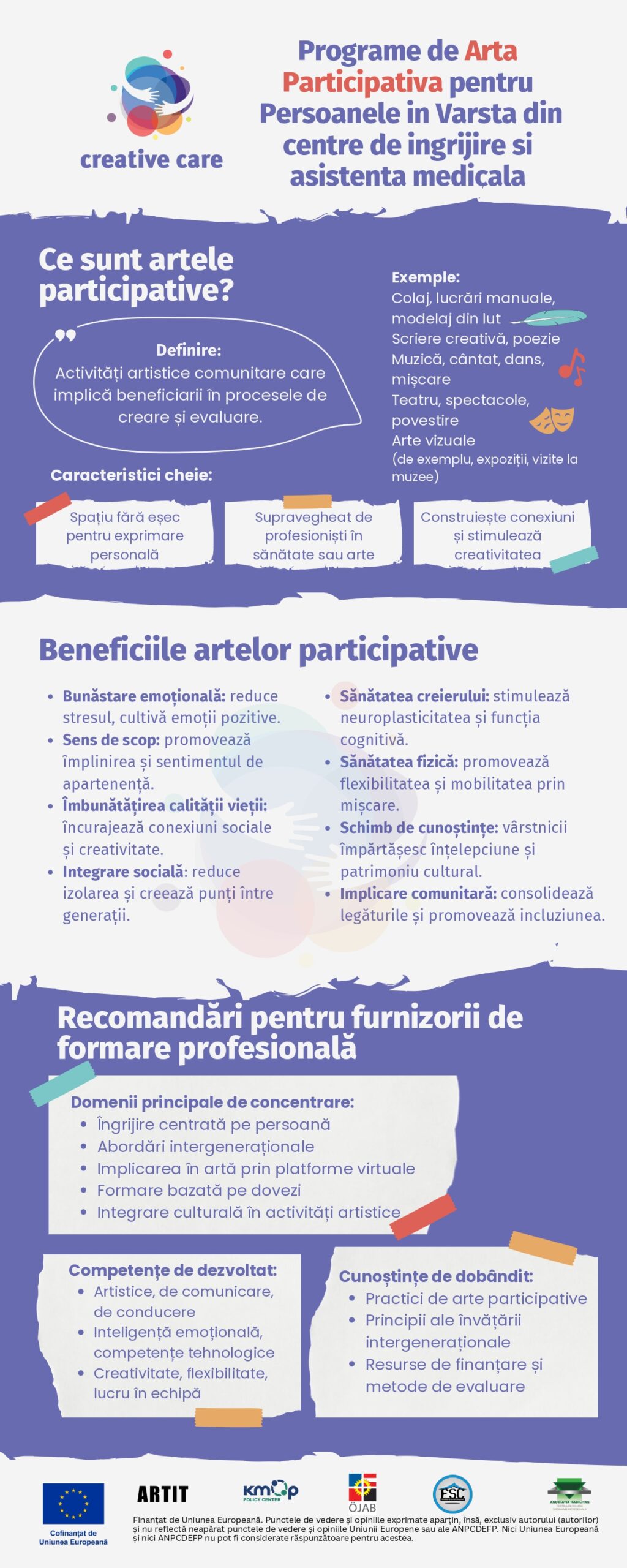 Recomandările urmăresc să depășească provocările și să abordeze nevoile de învățare ale profesioniștilor într-un mod eficient, precum și să sporească calitatea programelor VET oferite în domeniul programelor artistice creative pentru persoanele în vârstă din instituțiile de ingrijire medicala.